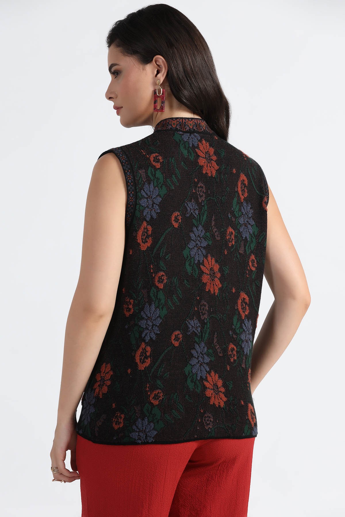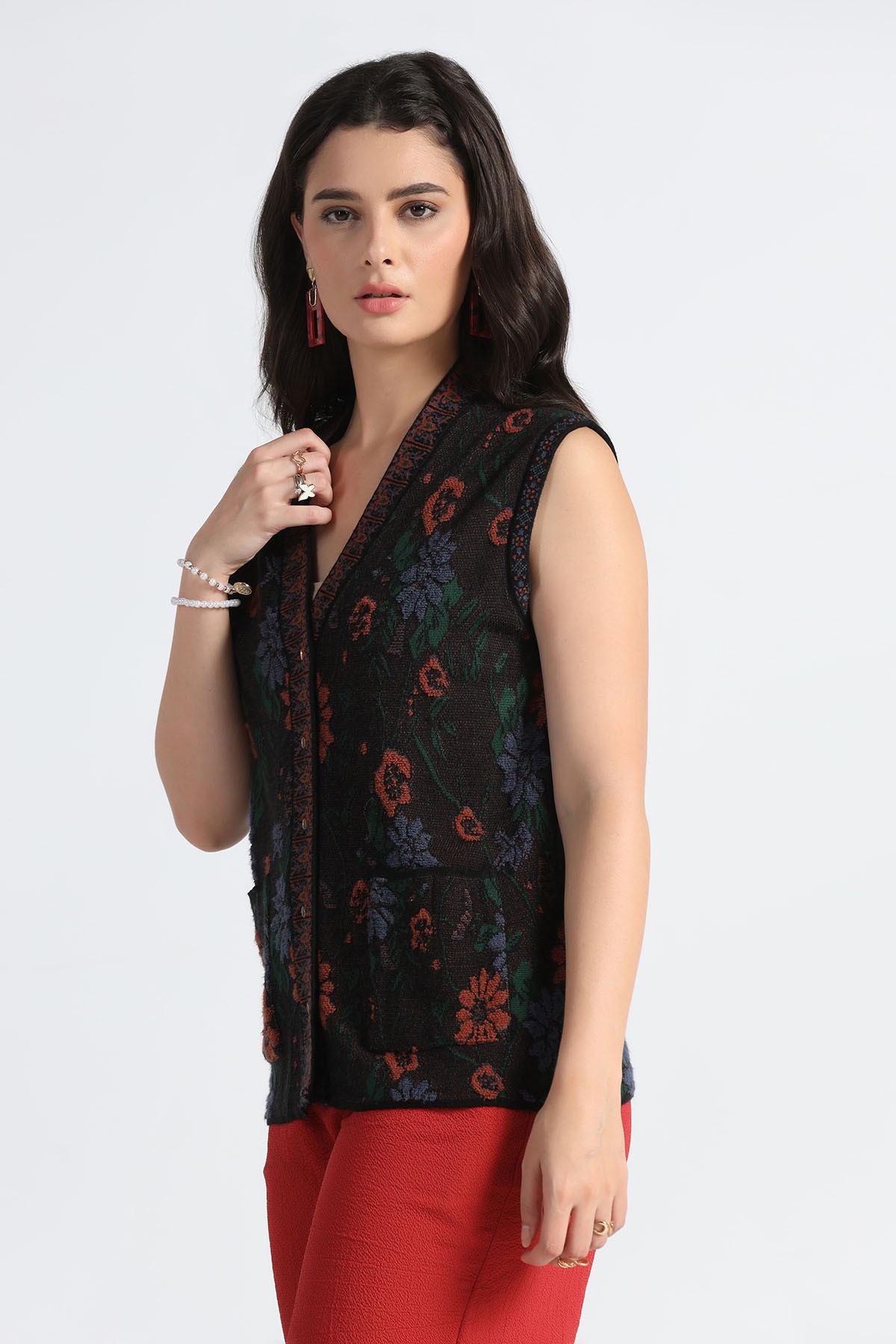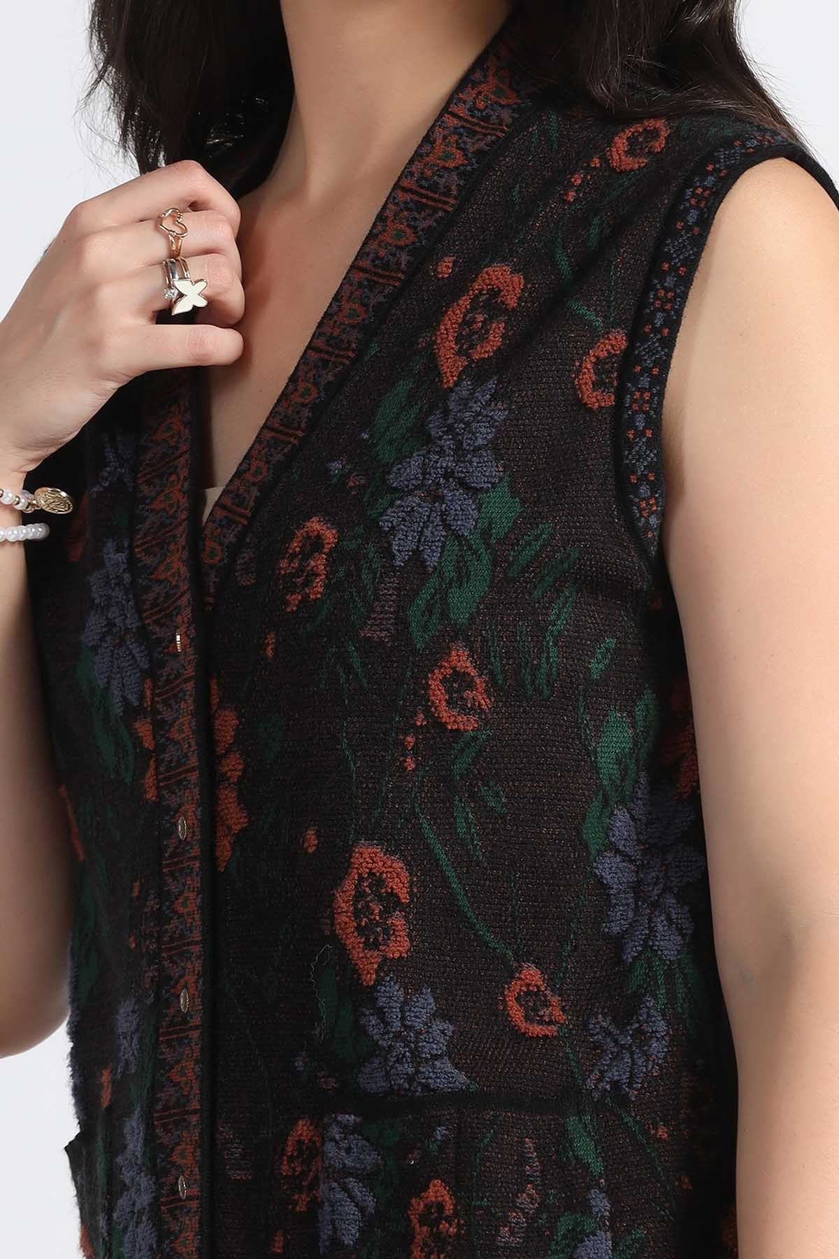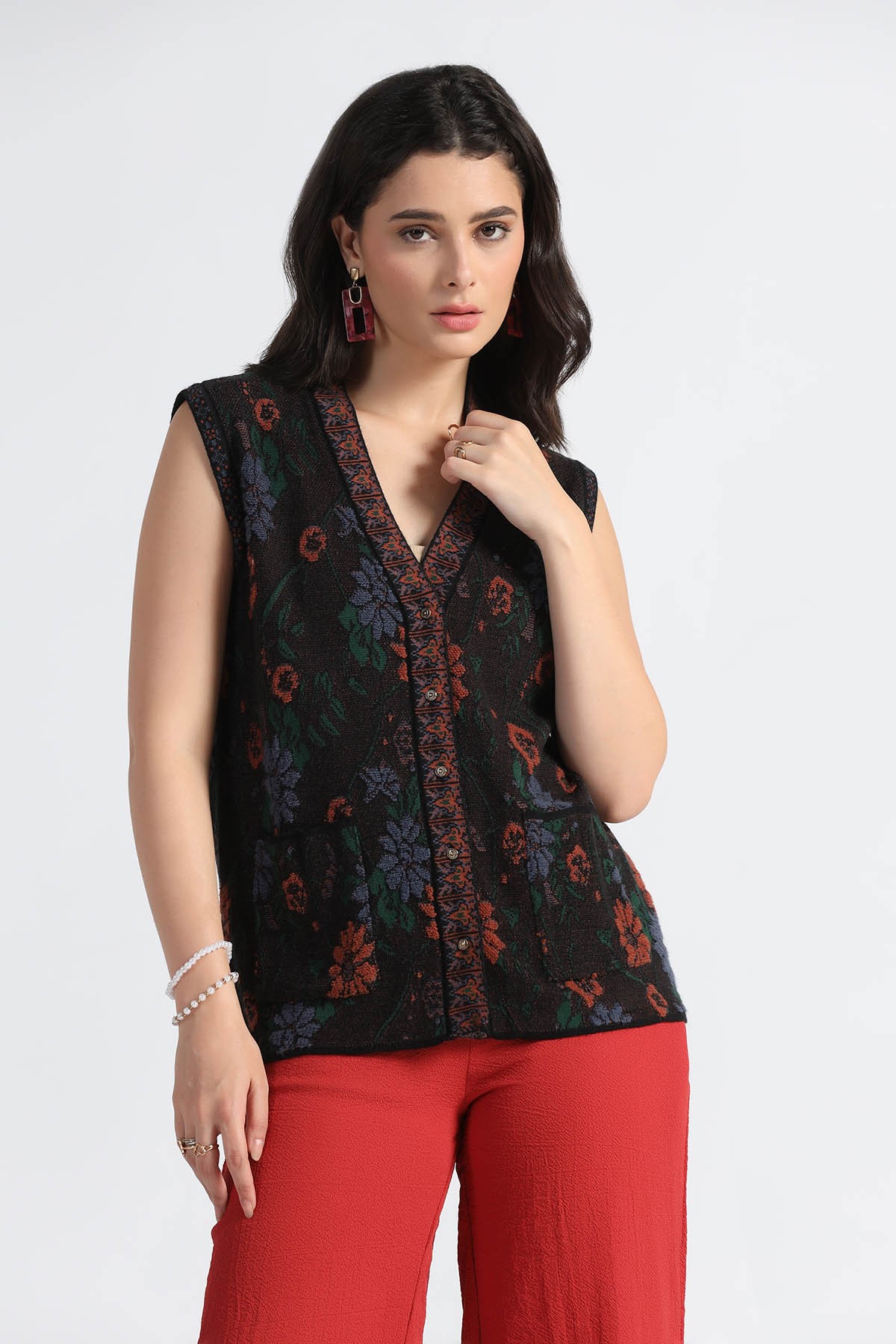 POINTELLE JACQUARD FLORAL PLUSH SLEEVELESS CARDIGAN