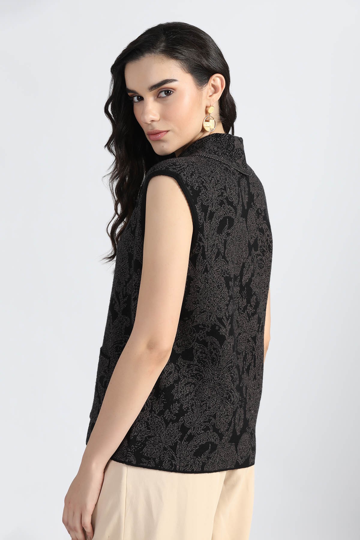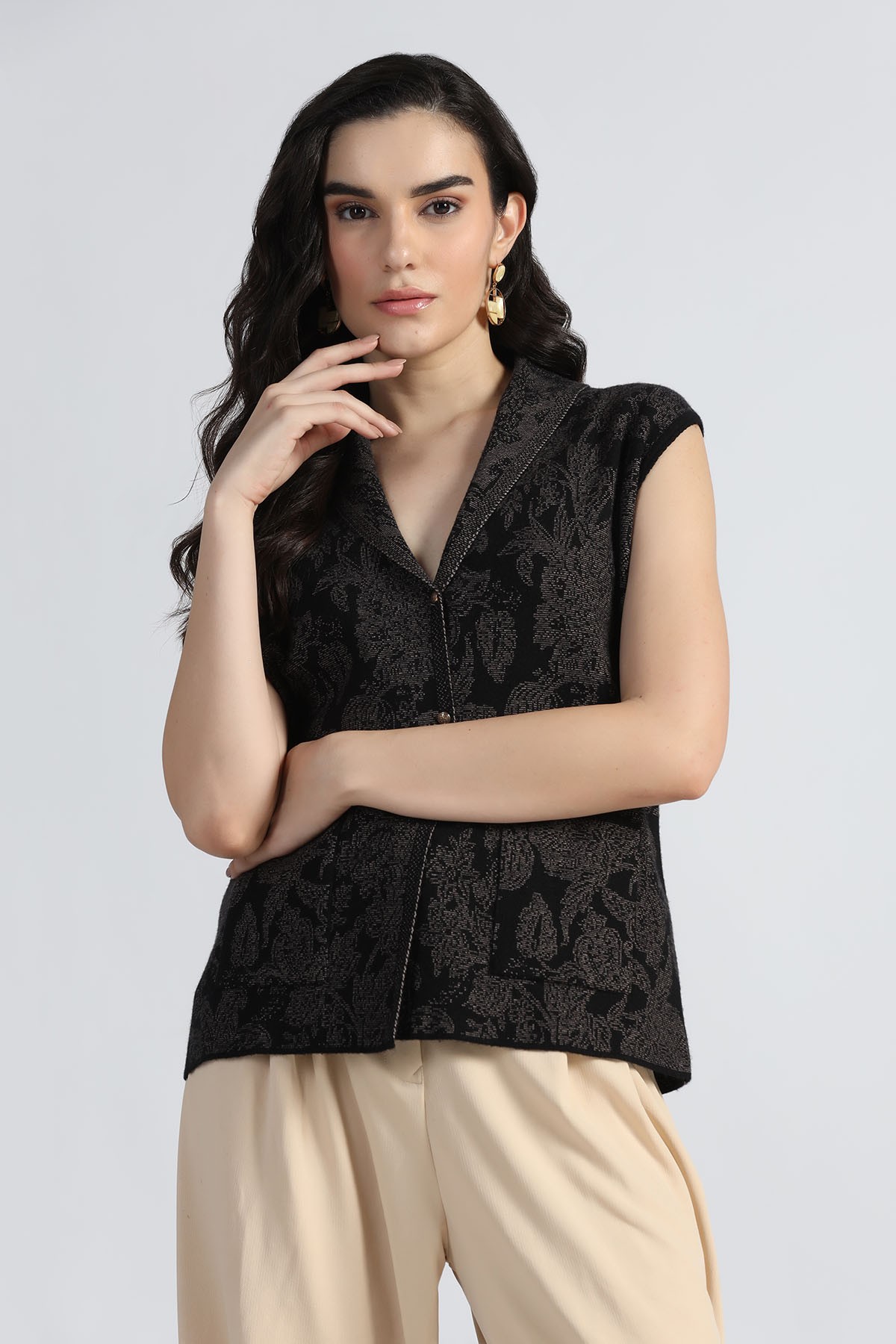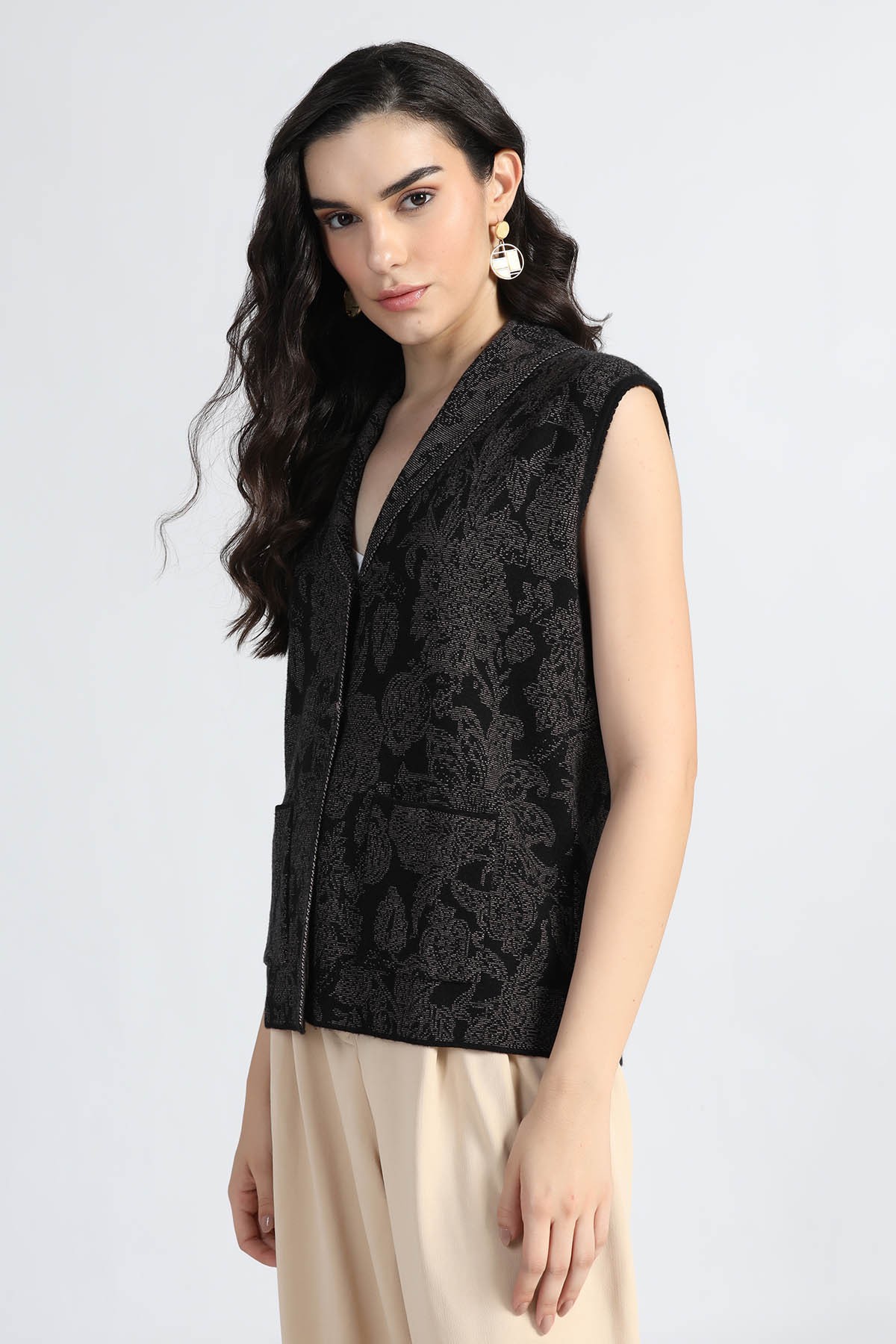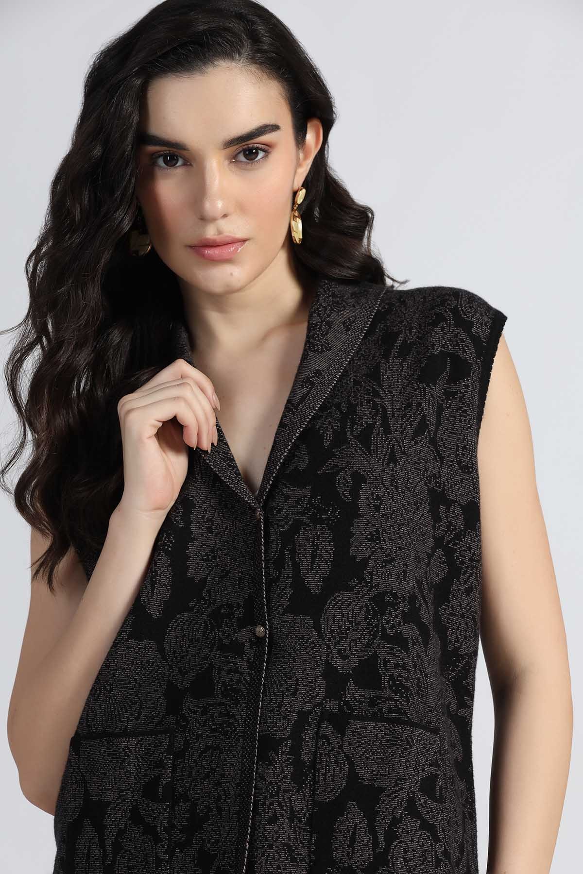 SHAWL COLLAR ORIENTAL FLORAL SLEEVELESS CARDIGAN
