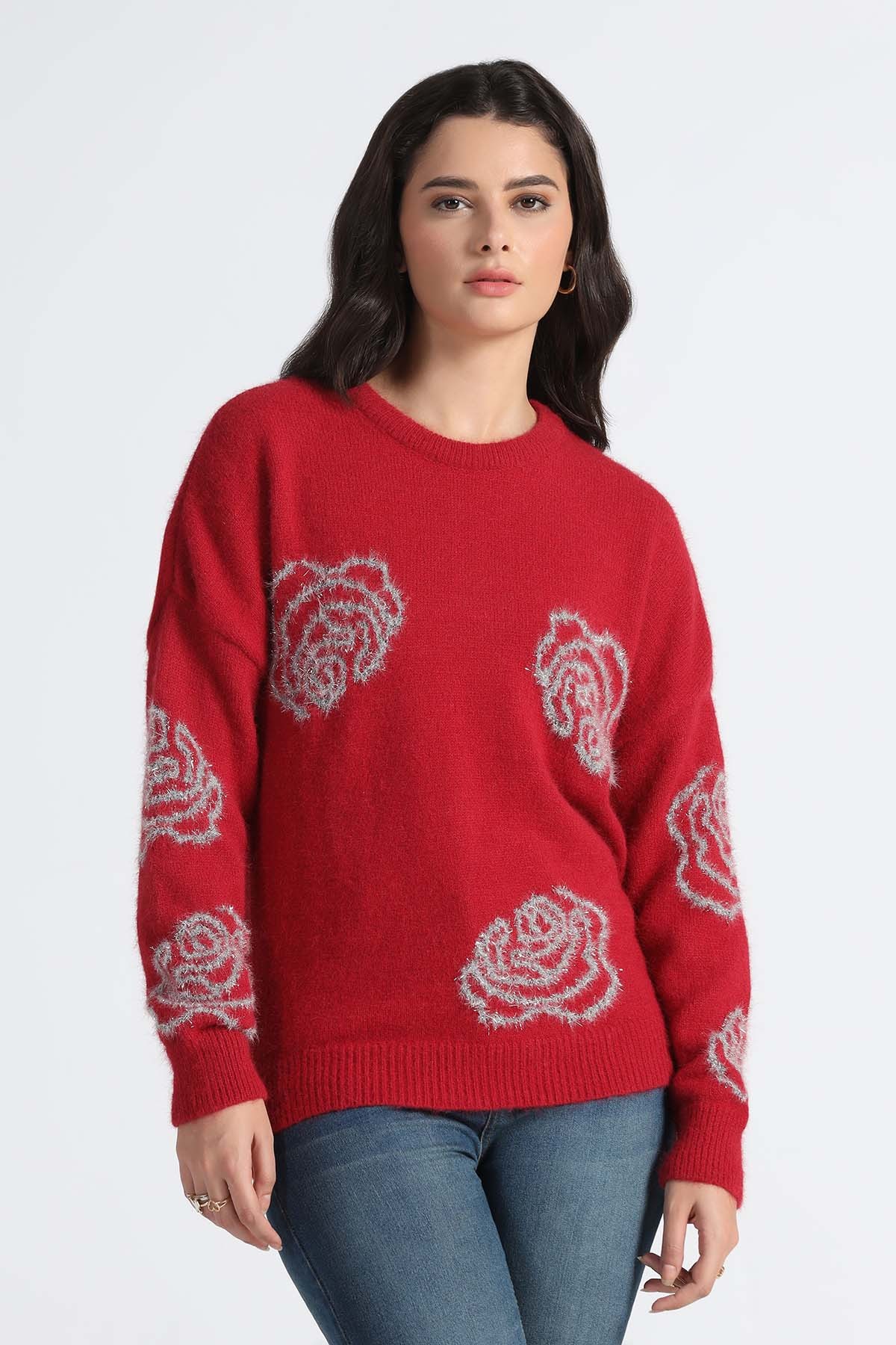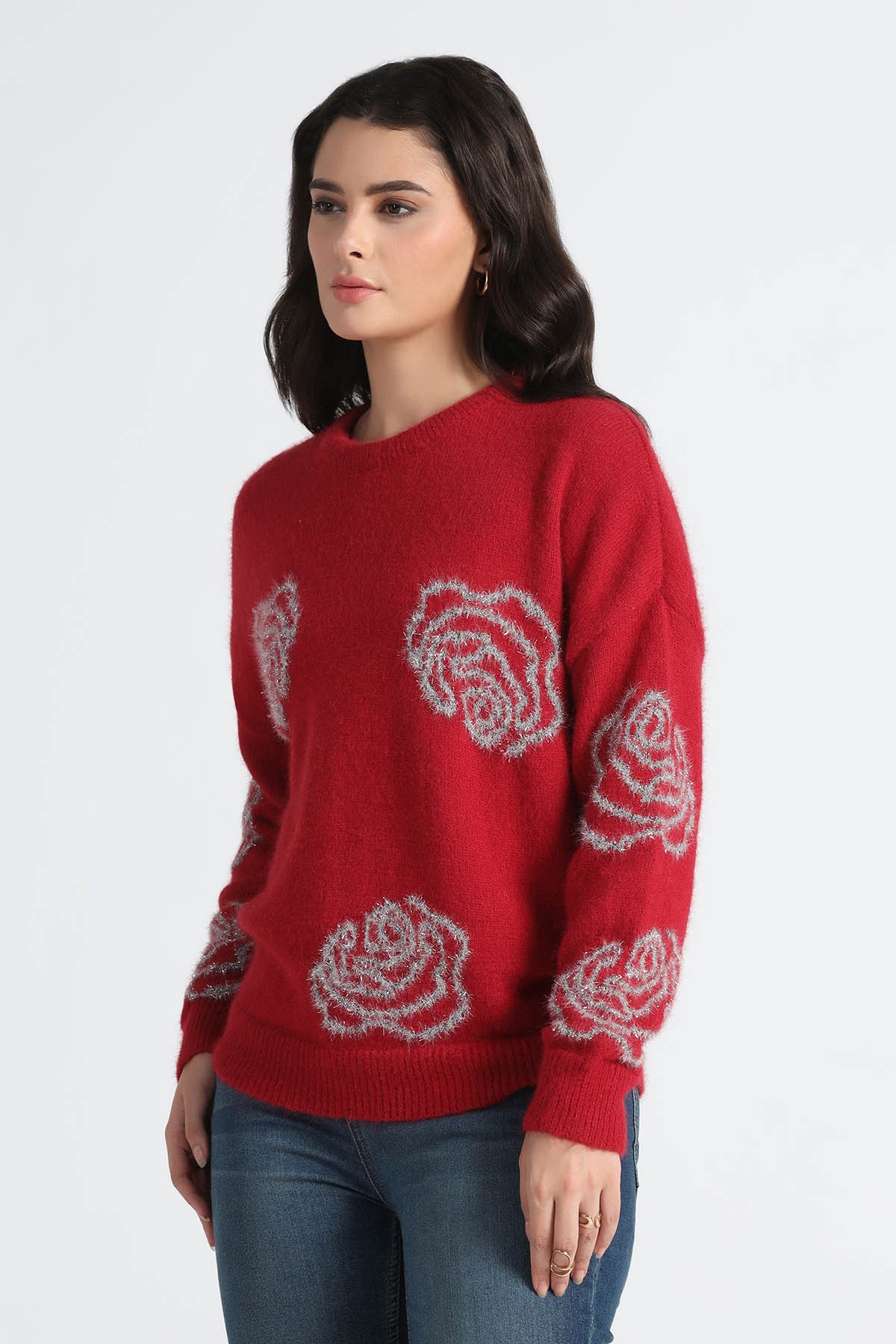 ROUND NECK FLORAL PLUSH TRANSFER JACQUARD SWEATER