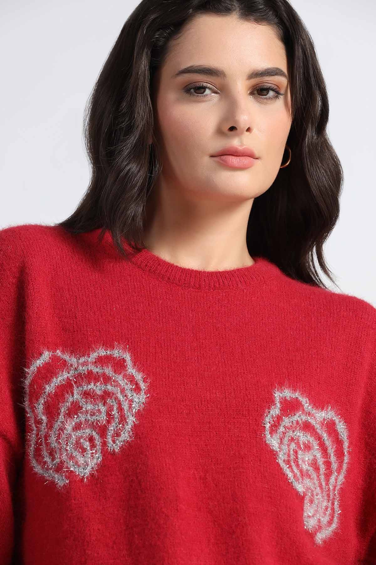 STUNNING METATLLC CORD EMBROIDERD ROUND NECK SWEATER
