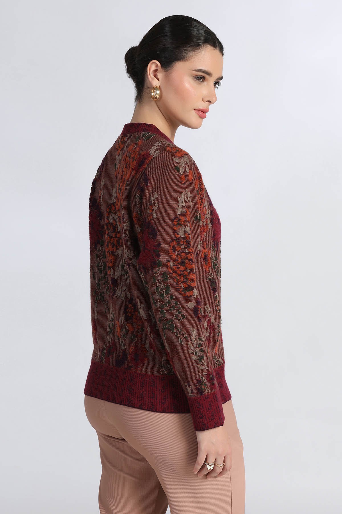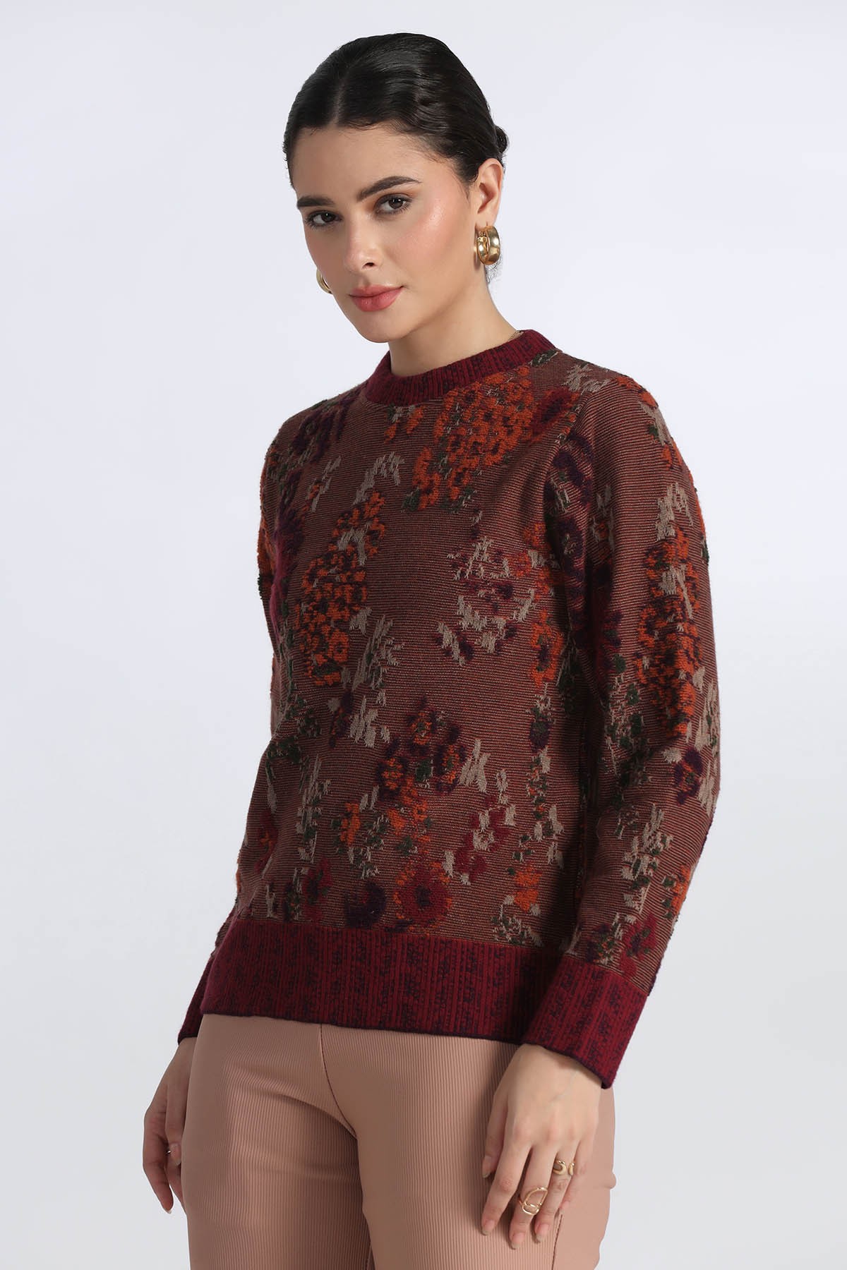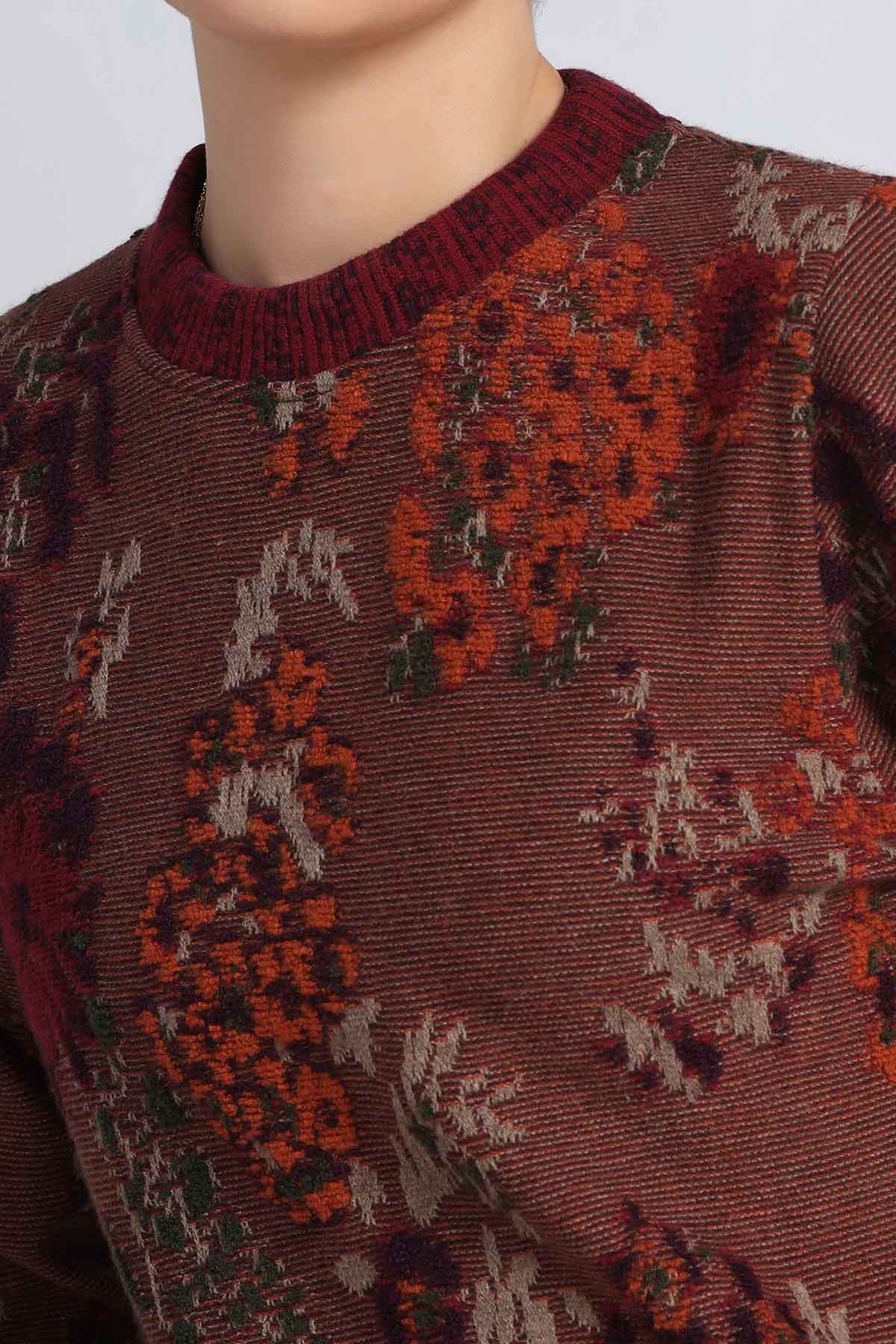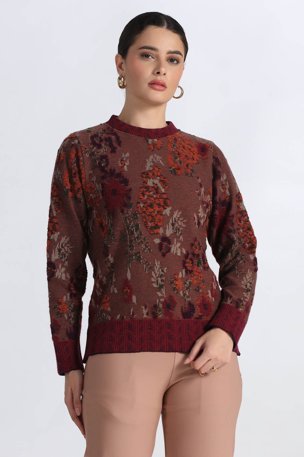 ROUND NECK FLORAL PLUSH TRANSFER JACQUARD SWEATER