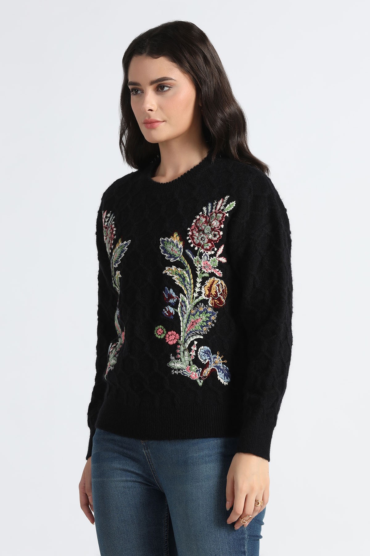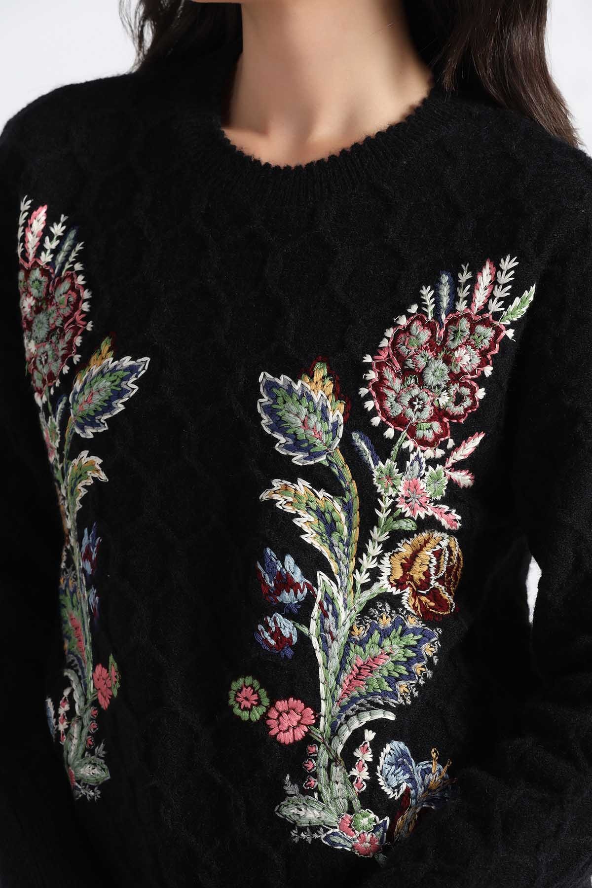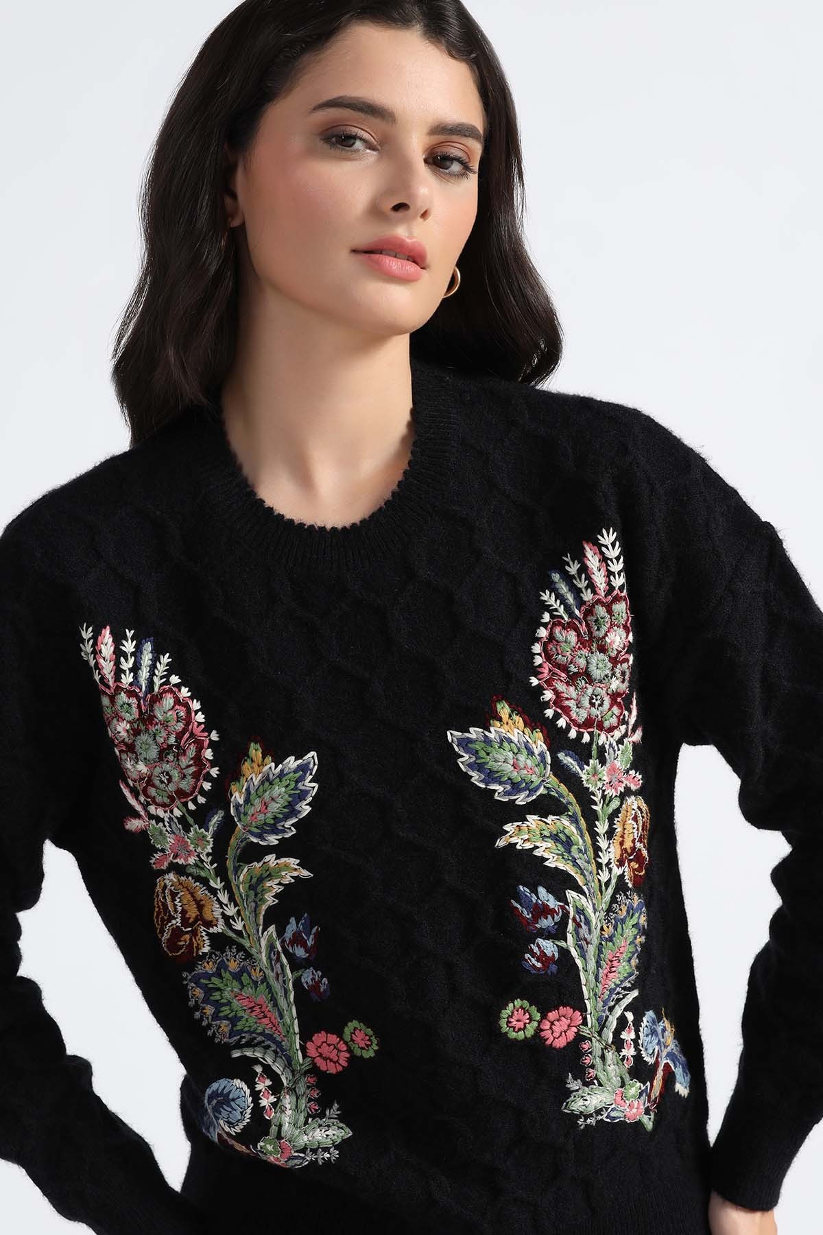 FLORAL EMBROIDERD CABLE KNIT ROUND NECK SWEATER