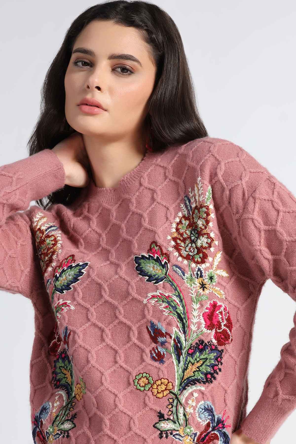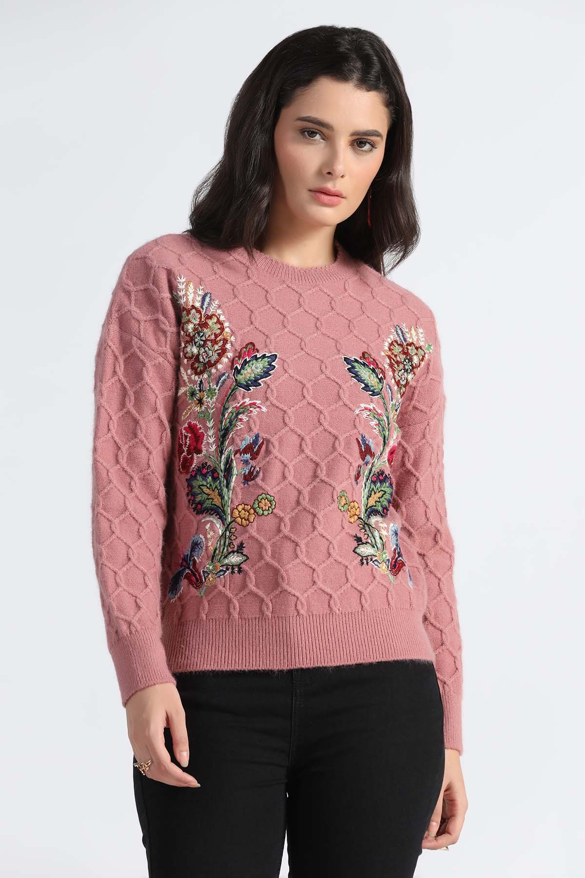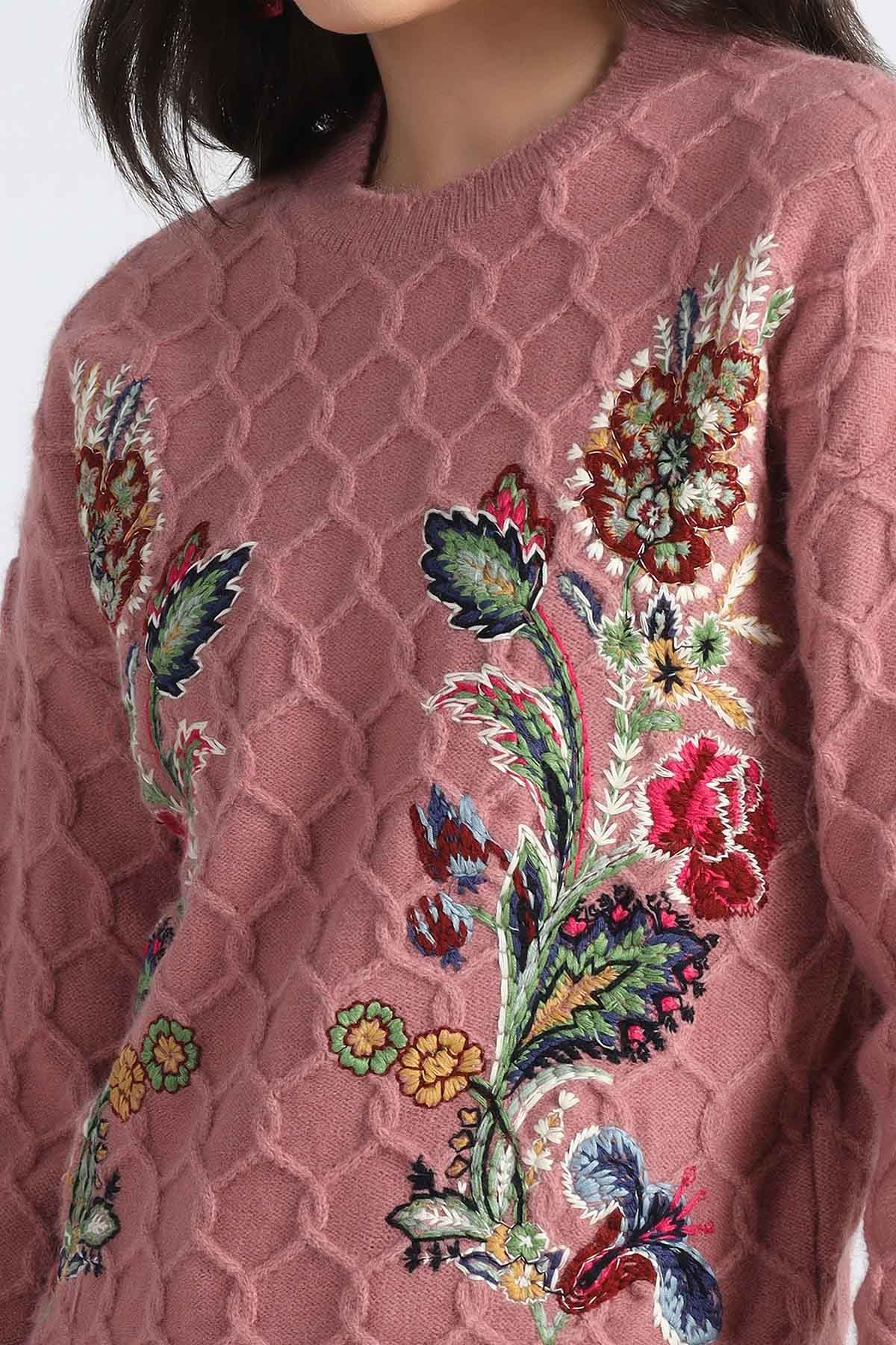FLORAL EMBROIDERD CABLE KNIT ROUND NECK SWEATER