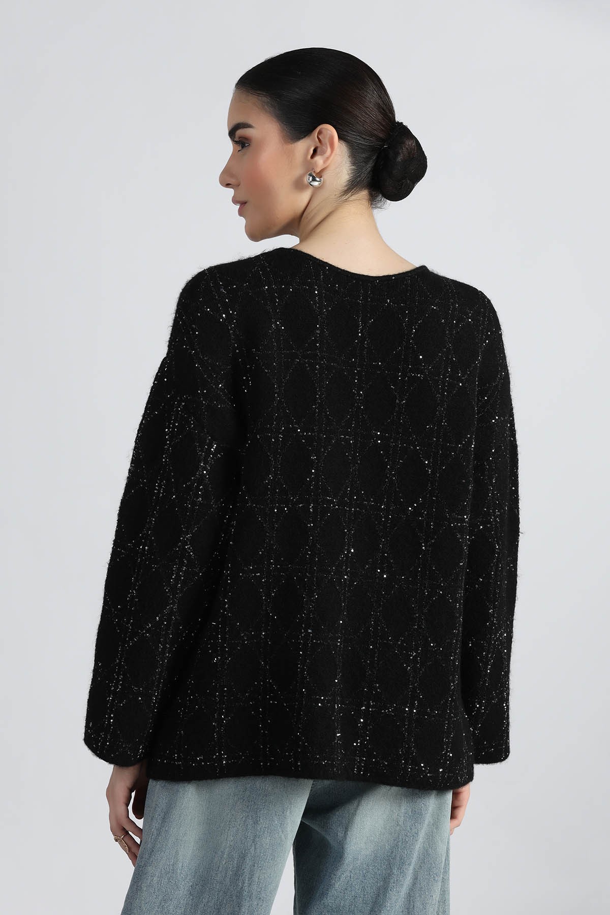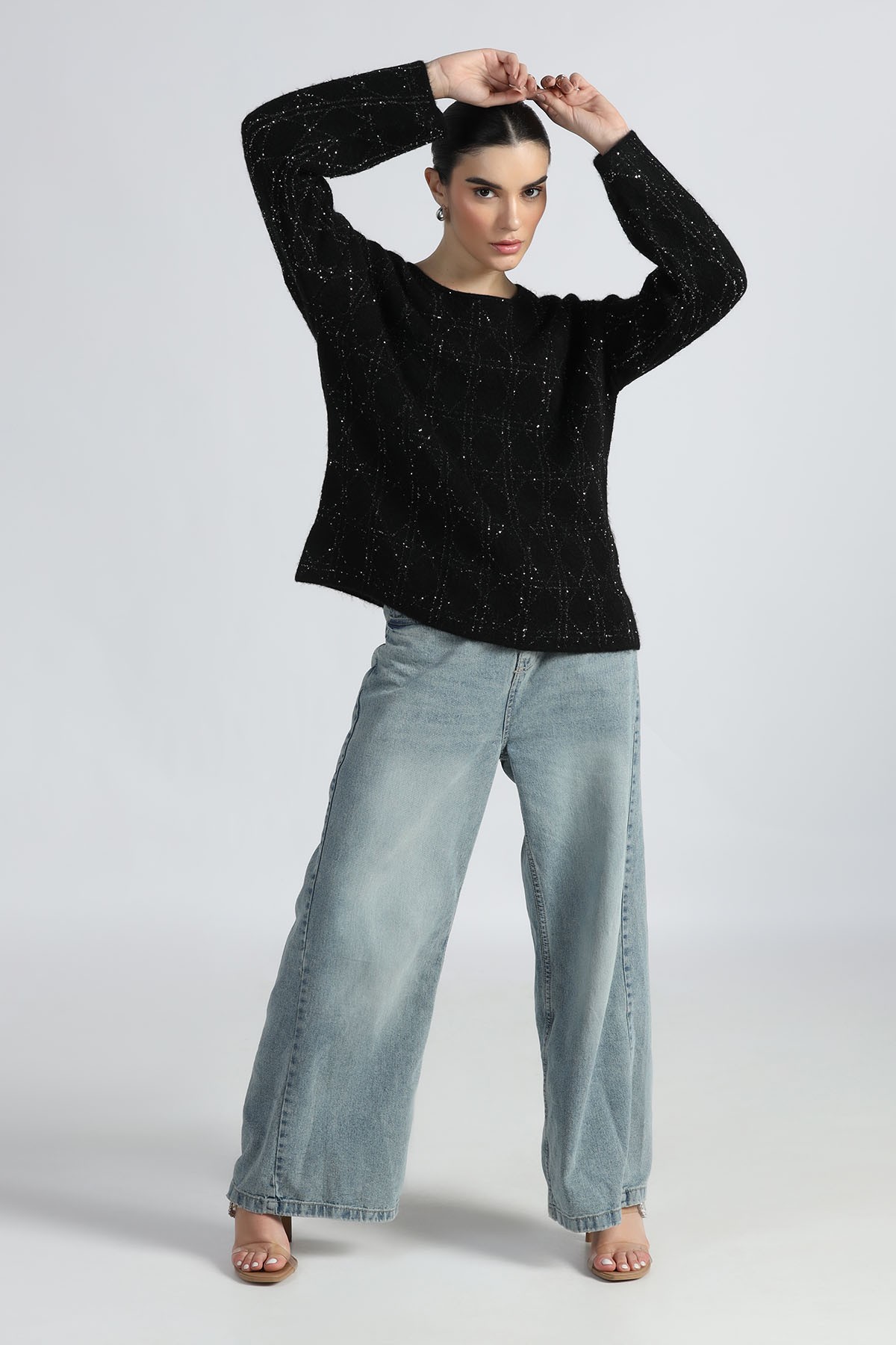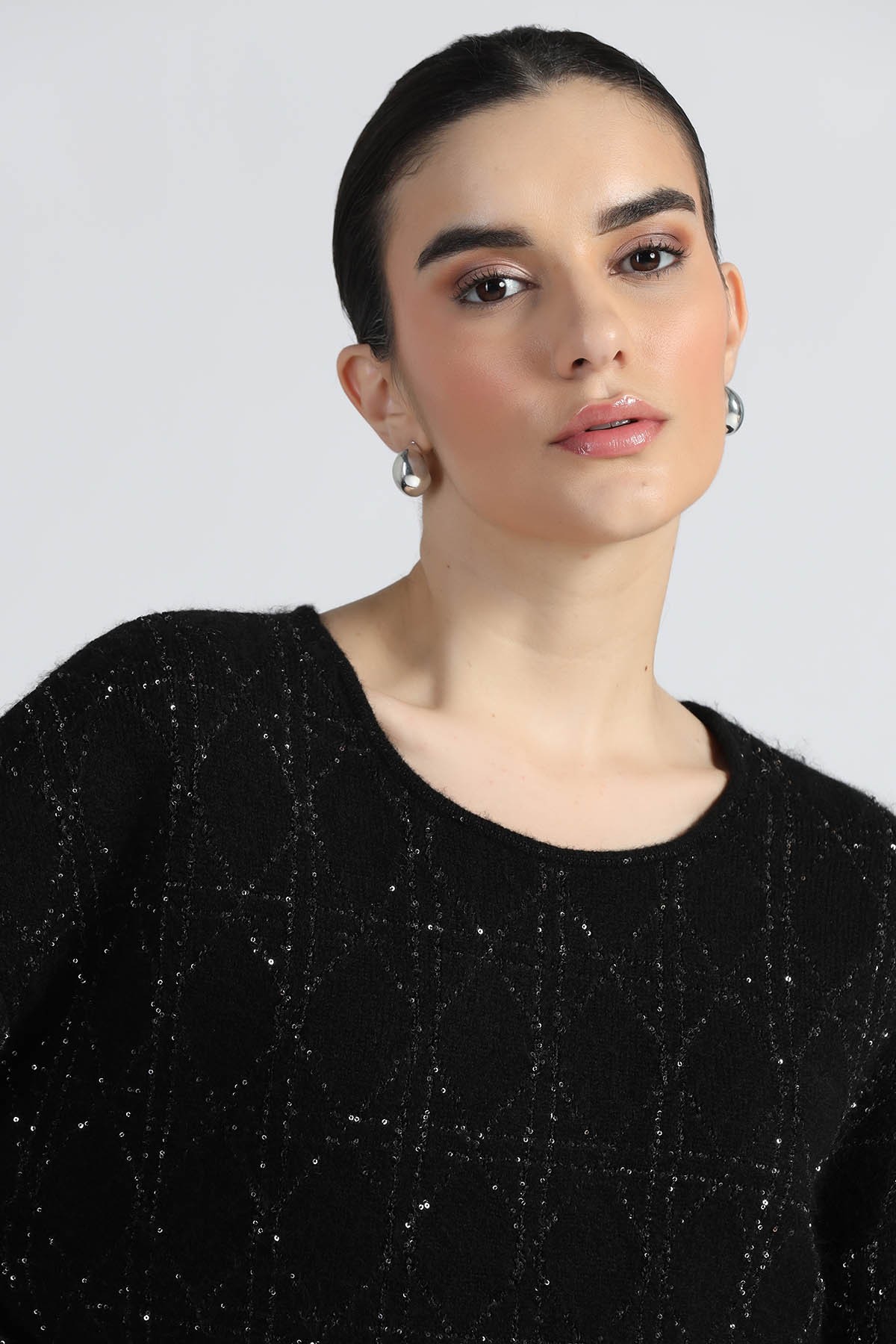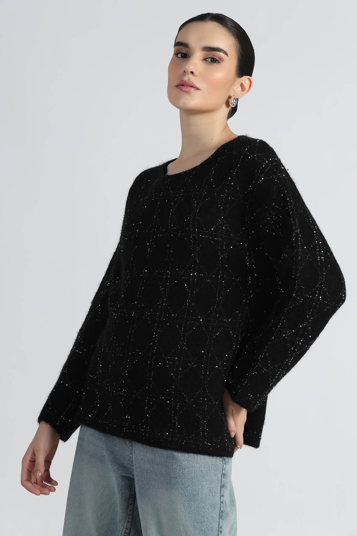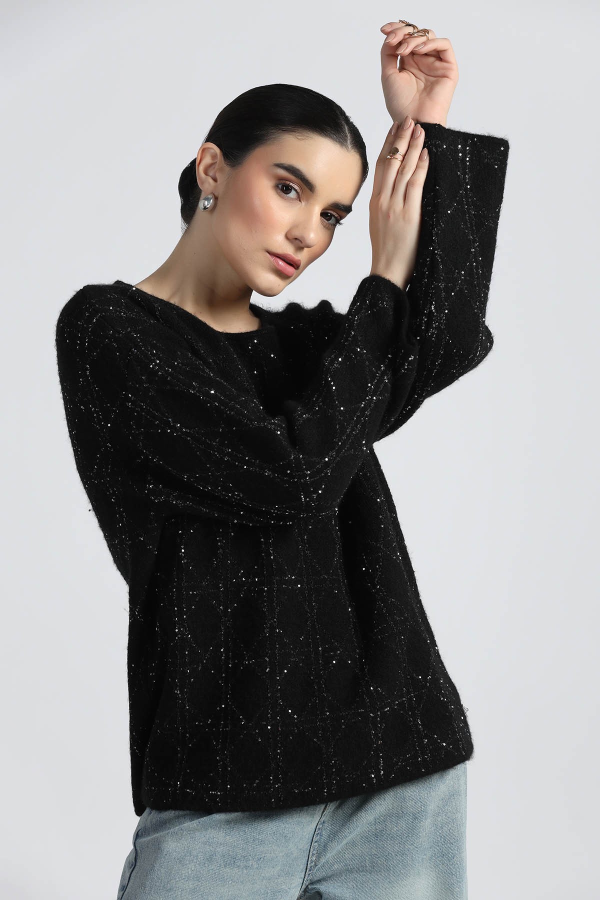 SEQUIN YARN CHECK ROUND NECK SWEATER