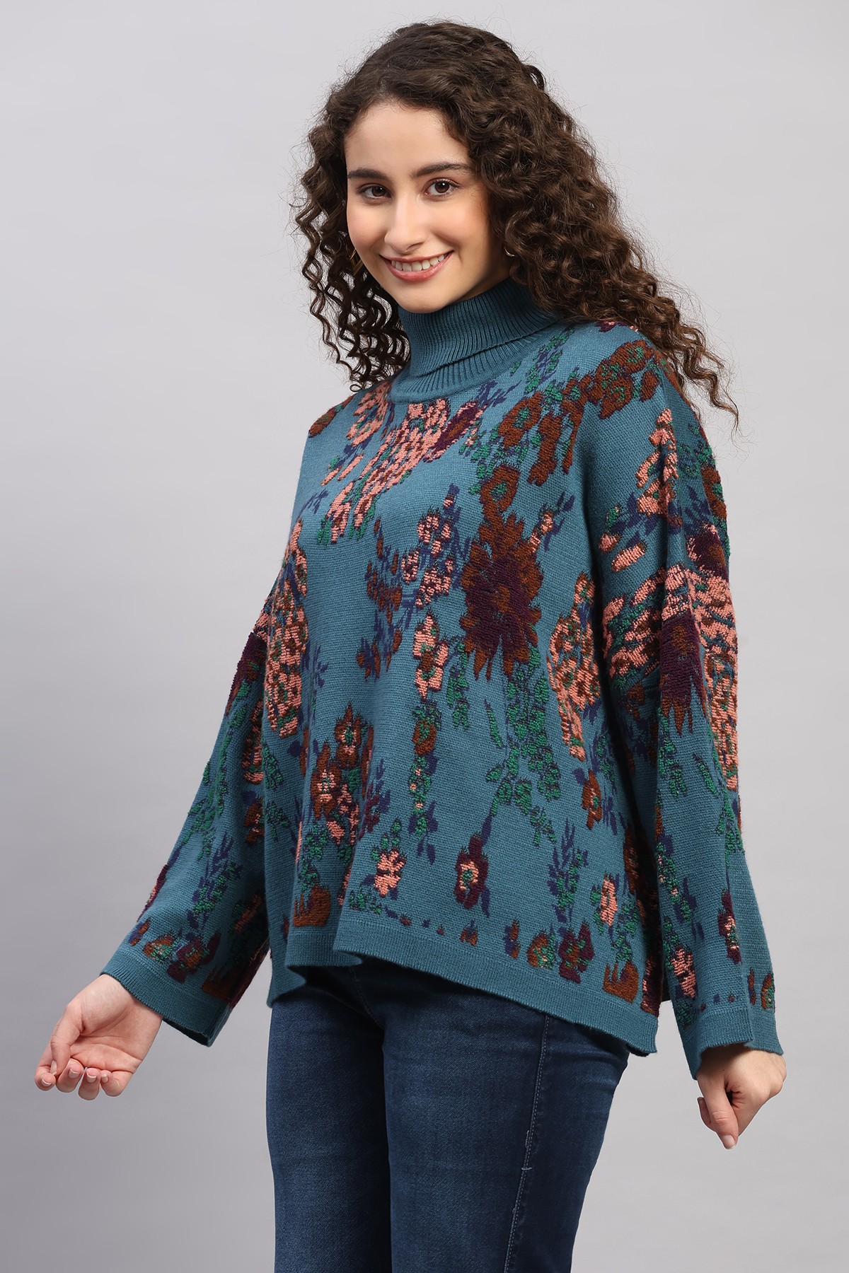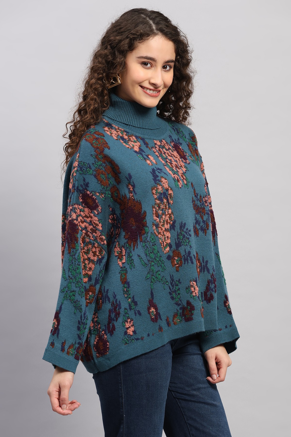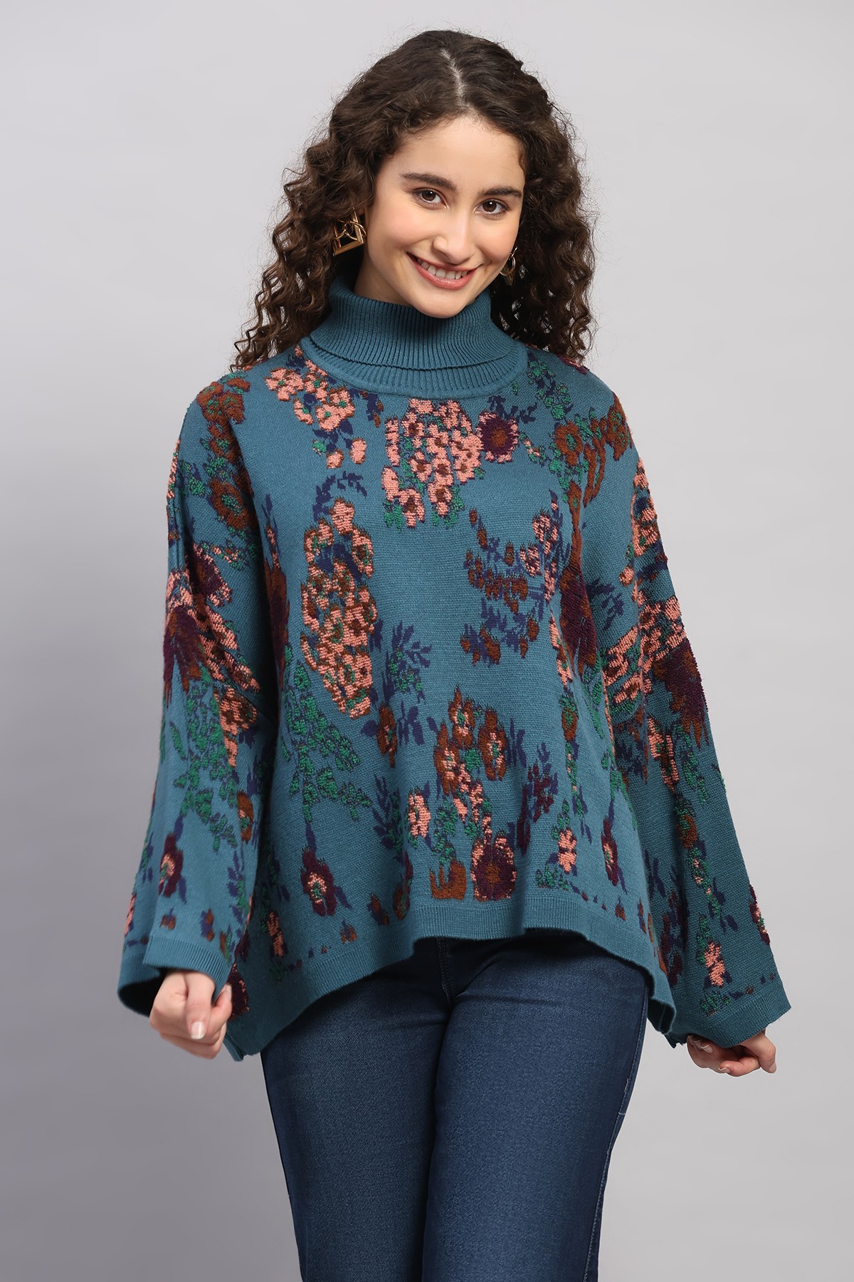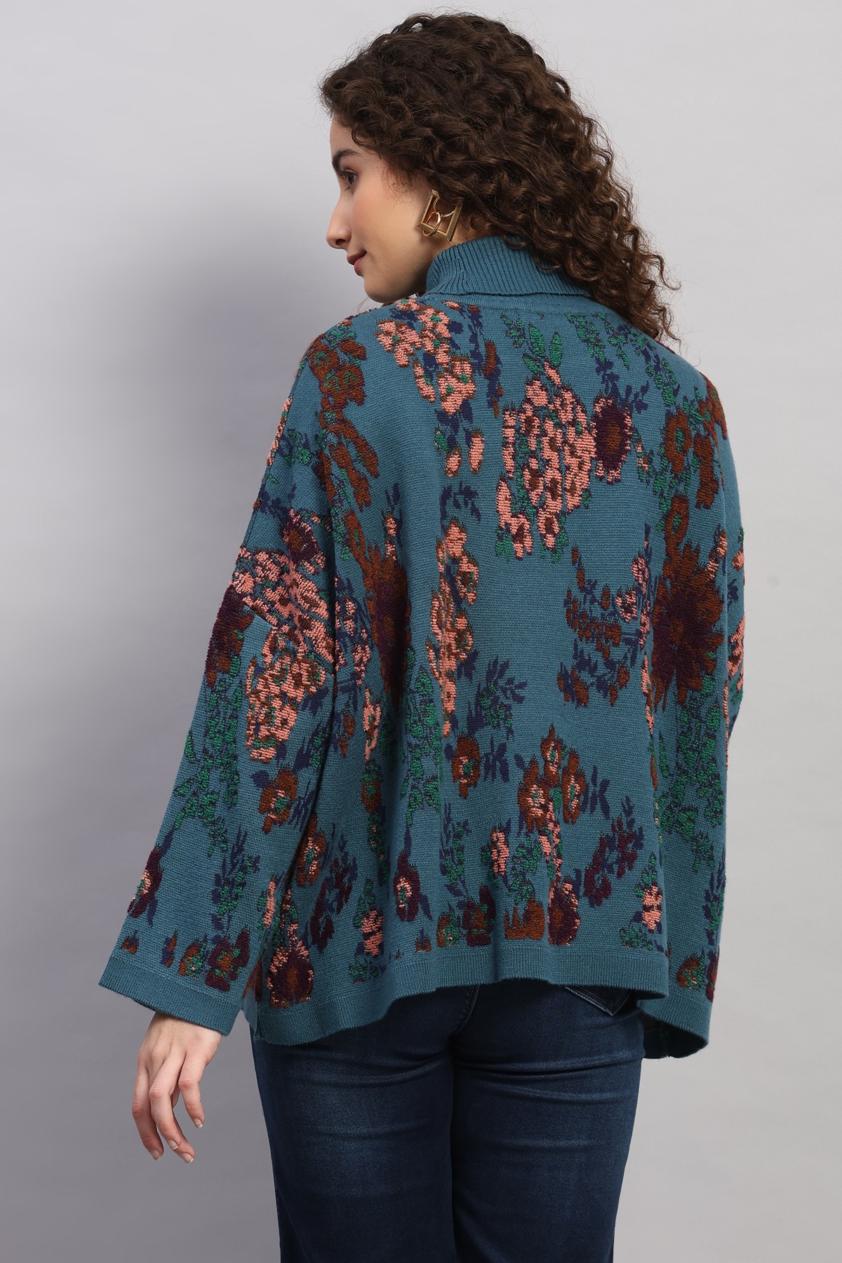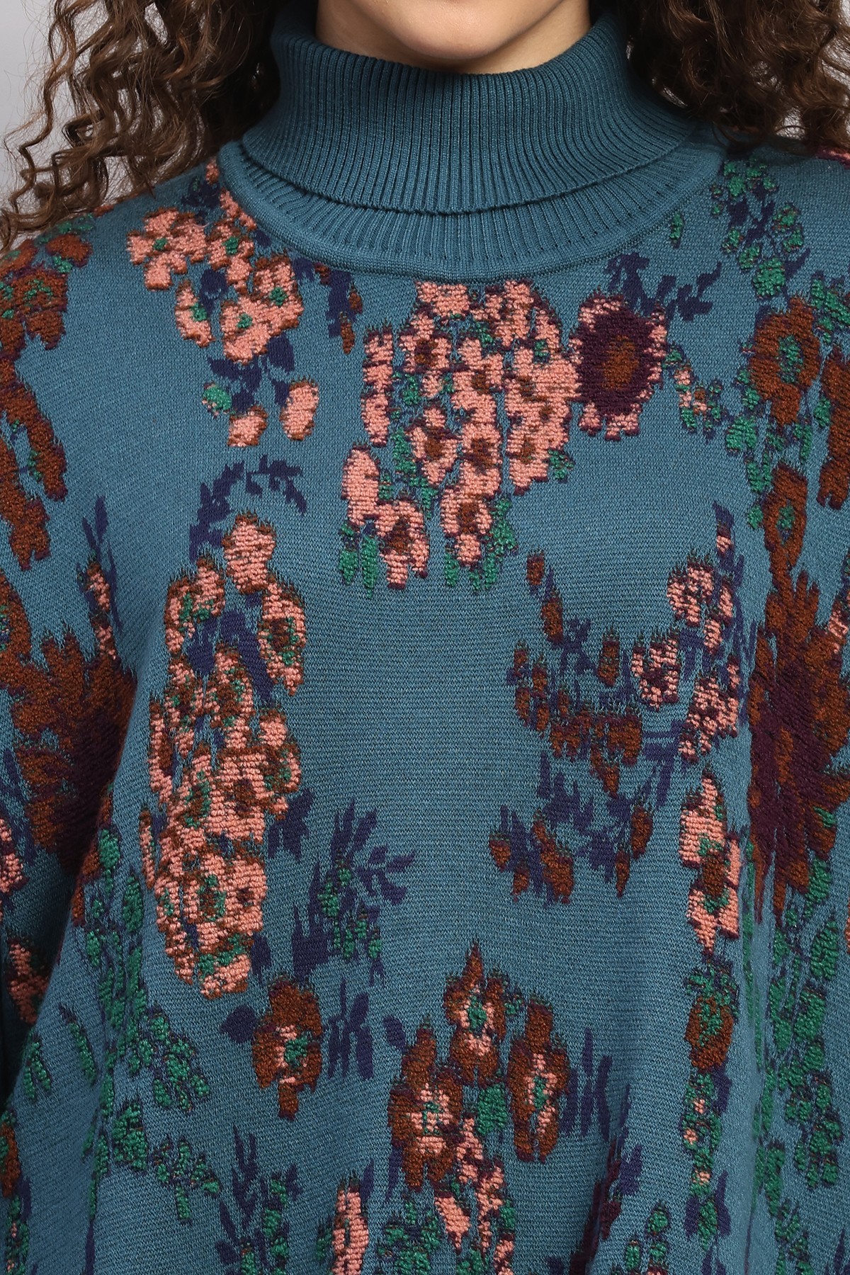 FLORAL PLUSH KNITED JACQUARD HIGH NECK PONCHO