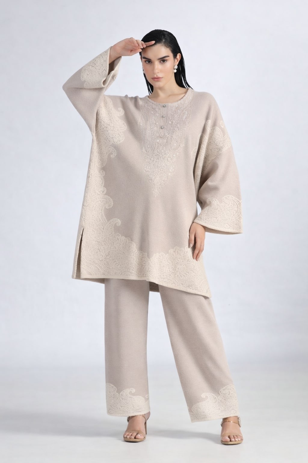 PAISELY JACQUARD KNITTED KAFTAN SET WITH NECK EMBROIDERY